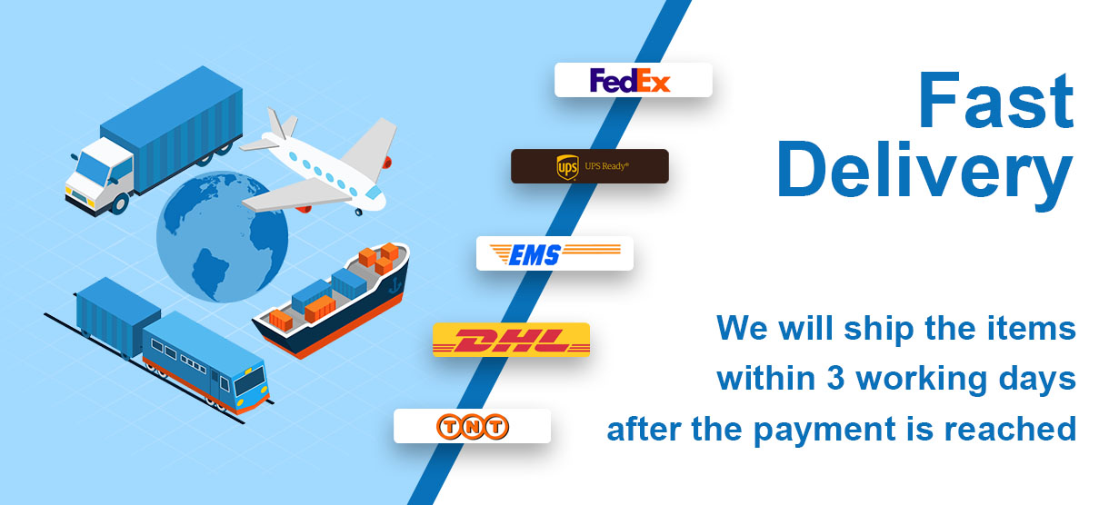 Мы сотрудничаем с несколькими курьерскими компаниями: DHL, TNT, UPS, EMS, Fedex для доставки товаров по всему миру.